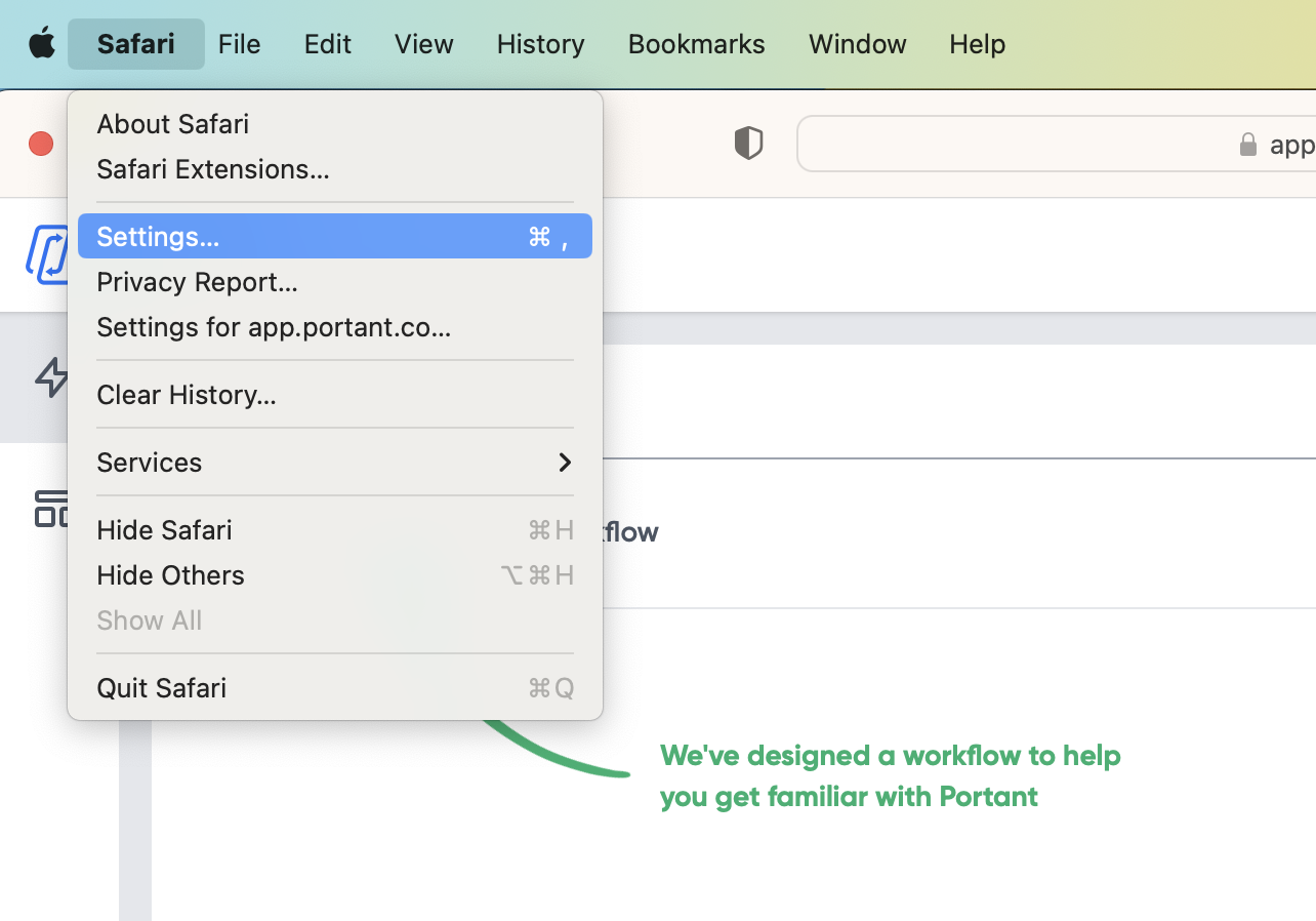 To open the console on Safari, you will first need to turn on the Develop menu. To do this, open the Safari menu in the Mac menu bar, then select Settings...
