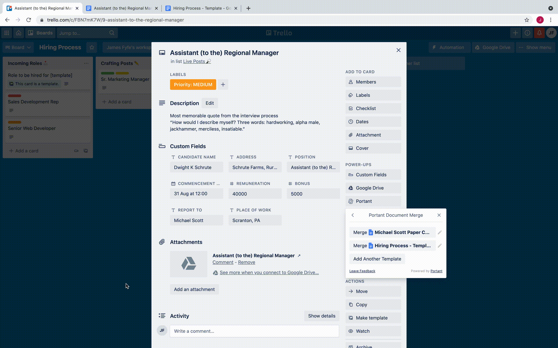 This creates a document with the card data and adds it to the attachment section of the card. Open the document to see the customised version.