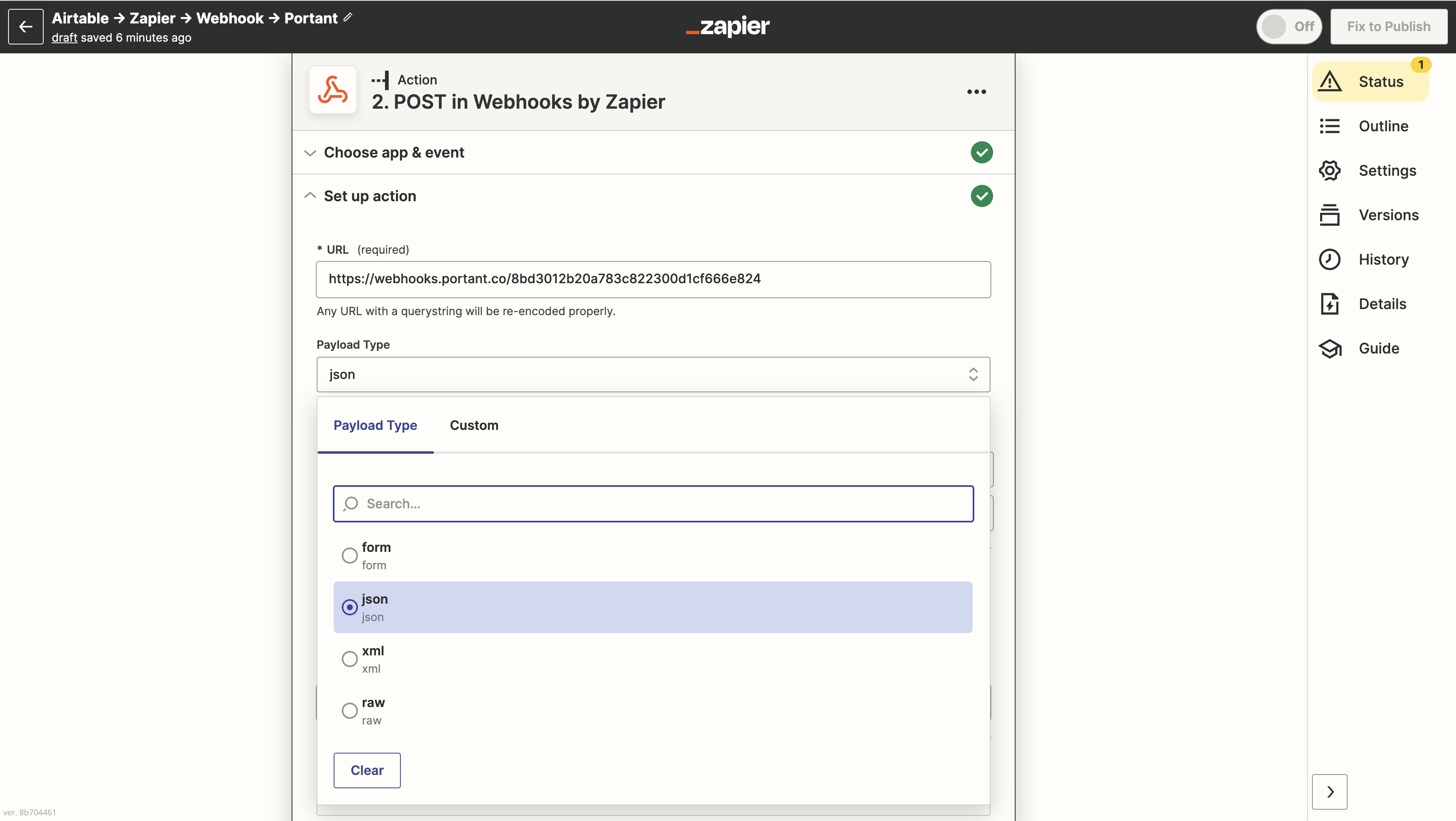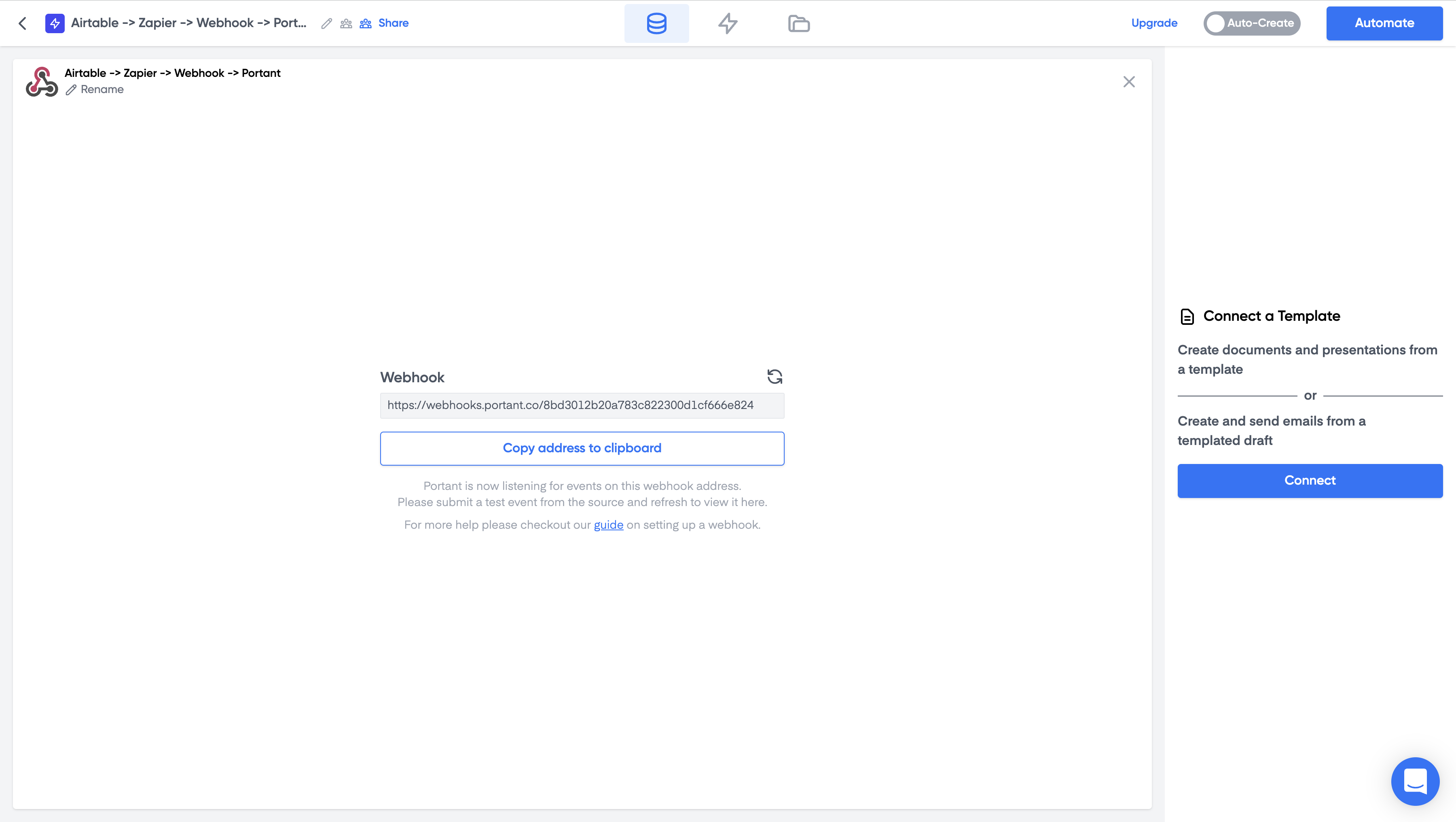 Copy the webhook address displayed in Portant and add it into your Zap, in the POST Webhooks by Zapier > Set up action > URL (required) field