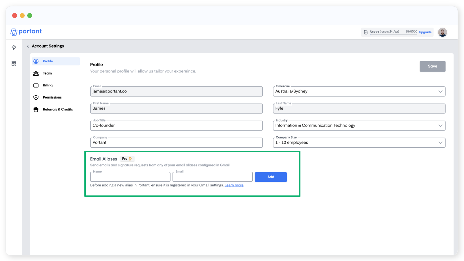 After you have added the new alias to your Gmail account the next step is to Open Portant.co and add the email address alias to your Portant account. As mentioned before, by default this all emails are sent from the email address you signed up with.