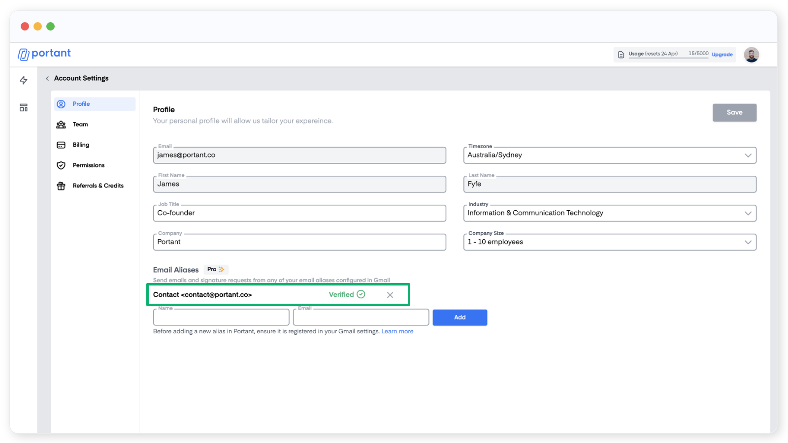 The first step is to Add the name, then add the email address and finally click verify. Clicking verify sends a test email to Portant to make sure it's all set up correctly. When you have correctly set up your alias, there will be a verified tag next to it.